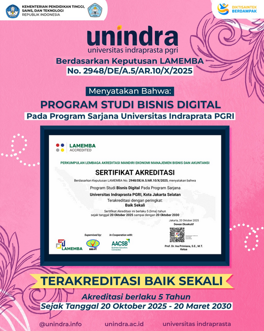 Hai teman-teman #Unindra. Akreditasi Program Studi Bisnis Digital pada Program Sarjana Universitas Indraprasta PGRI TERAKREDITASI BAIK SEKALI!