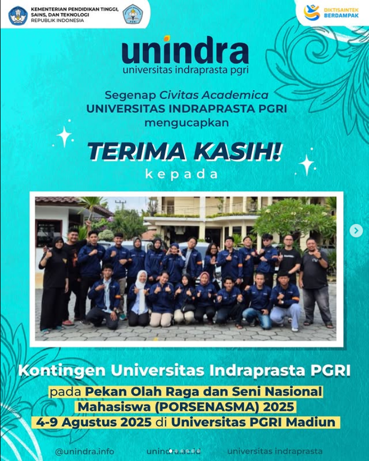 Segenap Civitas Academica Universitas Indraprasta PGRI mengucapkan Terimakasih banyak kepada “Kontingen Universitas Indraprasta PGRI “ Pada Pekan Olahraga dan Seni Nasional Mahasiswa ( PORSENASMA ) 2025 4-9 AGUSTUS 2025 Di Universitas PGRI MADIUN.