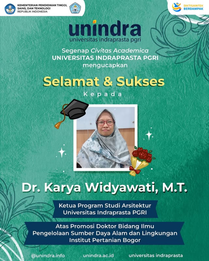 Selamat & Sukses Kepada Dr. Karya Widyawati, M.T. Dosen Program Studi Arsitektur Universitas Indraprasta PGRI Atas Promosi Doktor Bidang Ilmu Pengelolaan Sumber Daya Alam dan Lingkungan Institut Pertanian Bogor