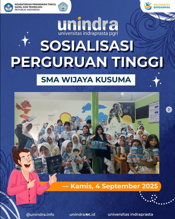 Universitas Indraprasta PGRI (UNINDRA) hadir di SMK WijayaKusuma untuk melaksanakan kegiatan sosialisasi perguruan tinggi. Terima kasih kepada SMK Wijayakusuma atas sambutan hangatnya dalam kegiatan Sosialisasi Perguruan. Kami sangat senang bisa berbagi informasi seputar program studi, jalur pendaftaran, dan beasiswa yang bisa kalian raih.