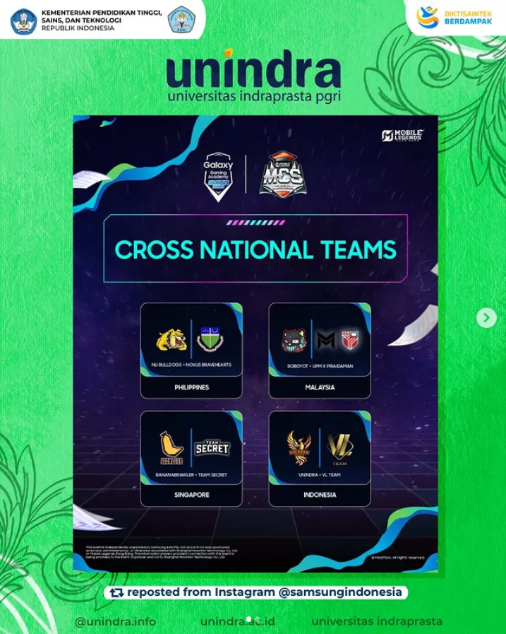 Dengan bangga mewakili Indonesia! 🇮🇩 Tim Mobile Legends UNINDRA siap bertanding di turnamen Cross National Teams. Mari kita dukung Kakaatzy, Learn, Arssstzy, Num, dan Scorch!