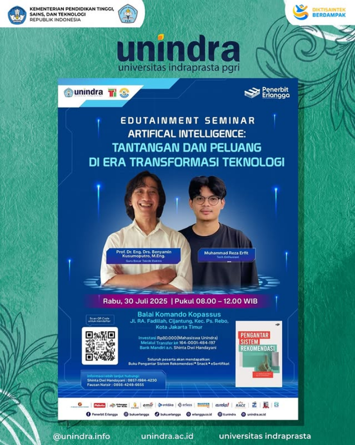 Universitas Indraprasta PGRI bekerja sama dengan Penerbit Erlangga akan mengadakan seminar edutainment yang inspiratif dan penuh wawasan seputar teknologi terkini, khususnya Artificial Intelligence.