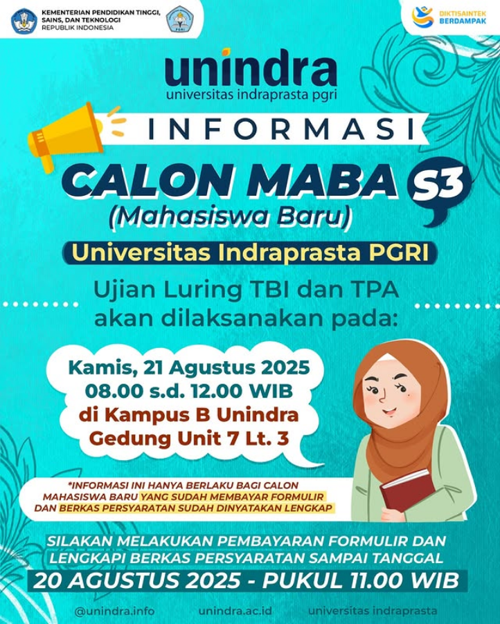 Hai teman-teman calon mahasiswa/i baru S3. Tes TBI dan TPA akan dilaksanakan pada hari Kamis, 21 AGUSTUS 2025 pukul 08.00 - 12.00 WIB di Kampus B unindra.