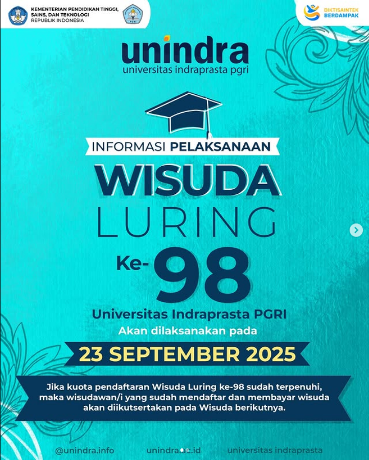 INFORMASI WISUDA KE - 98✨ Hai teman-teman UNINDRA😊 Wisuda ke-98 akan dilaksanakan pada hari Selasa, 23 SEPTEMBER 2025. Saat ini kuota wisuda masih tersedia.